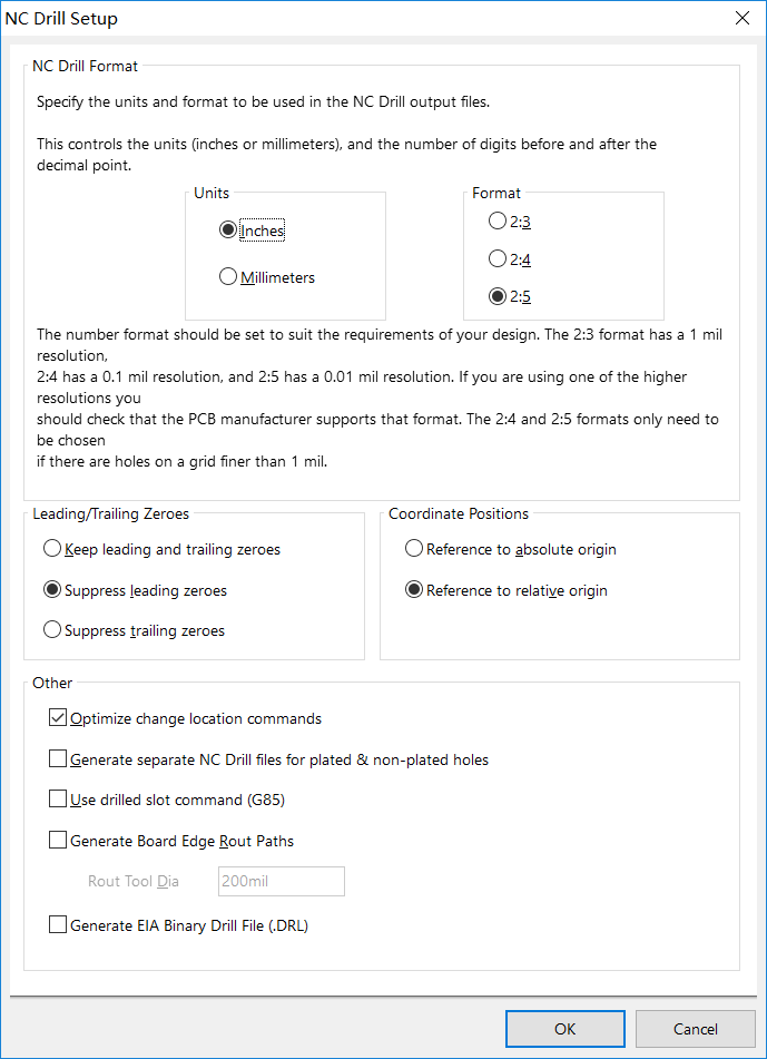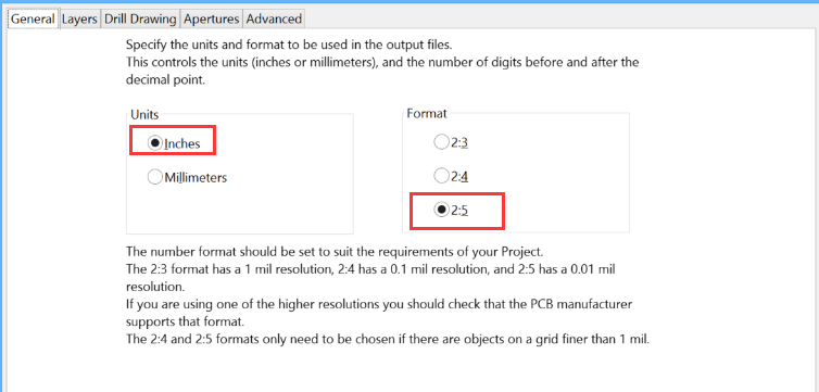 Trong Thẻ General tùy chọn Unit là Inches và Format là 2:5 (độ phân dải 0.01mil)