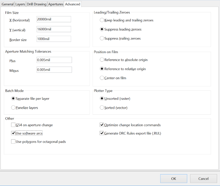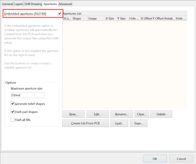 Tại thẻ Apertures - Tích chọn Embedded apertures (RS274X)