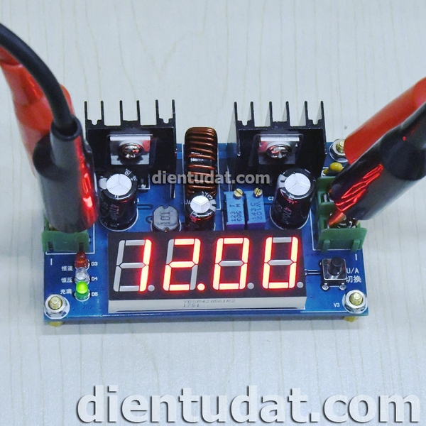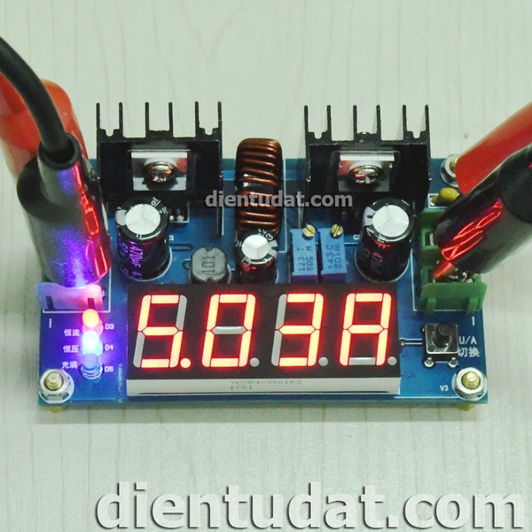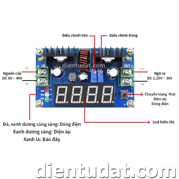 Mạch sử dụng chip XL4016 có chức năng hạ áp với dòng tải tối đa 8A, mạch được thiết kế 2 chiết áp điều chỉnh điện áp và dòng điện, ngoài ra mạch còn được trang bị led 7 đoạn giúp hiển thị thông số điện áp và dòng điện cho giao diện trực quan.