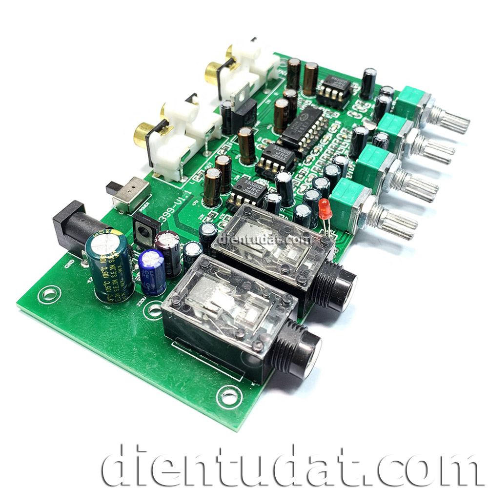 Mạch sử dụng Chip PT2399 và Opamp JRC5532. Ngoài ra mạch được tích hợp chức năng cách ly tín hiệu khi không cắm Micro giúp giảm nhiễu tín hiệu nhạc khi không sử dụng Micro.