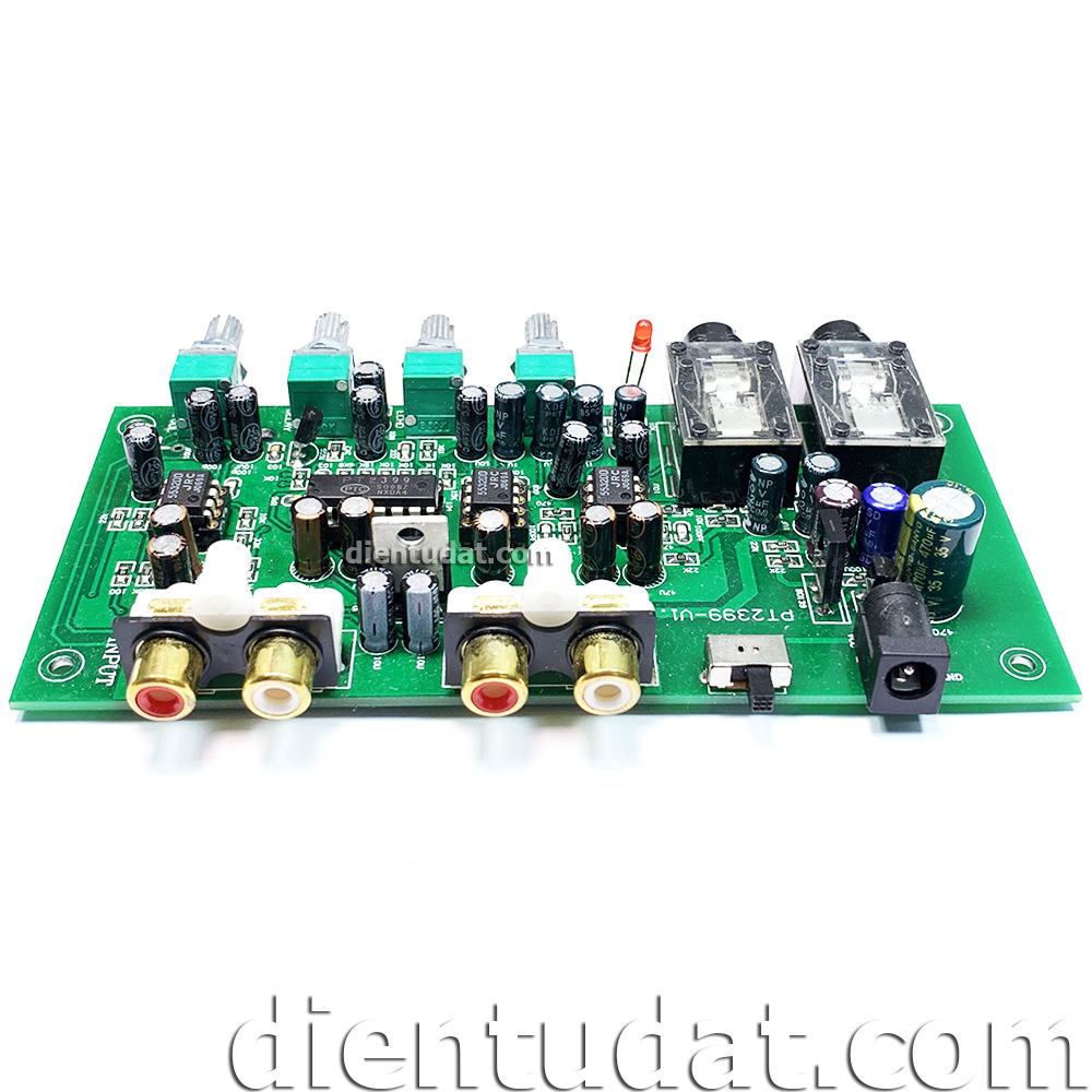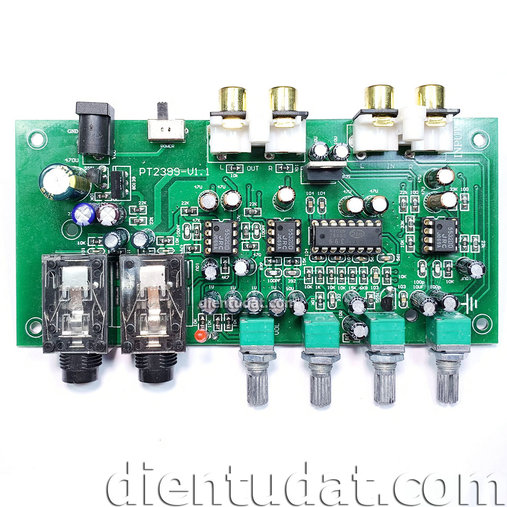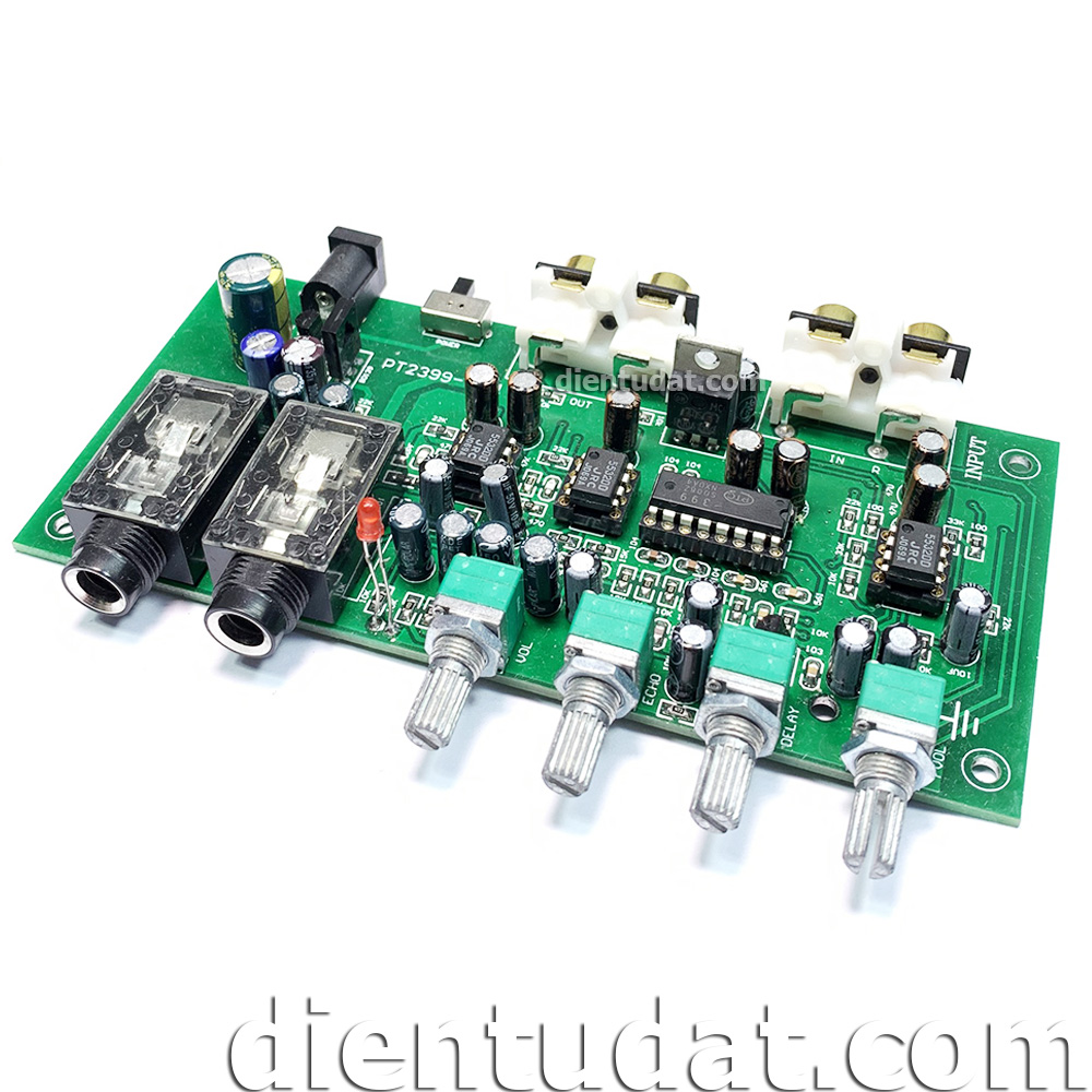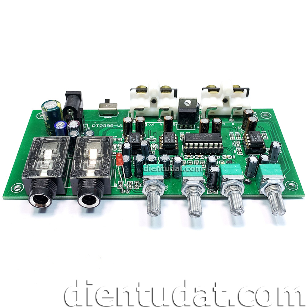 Mạch KARAOKE PT2399 Nguồn 12VDC có chức năng trộn tín hiệu âm thanh từ Micro và tín hiệu nhạc, đồng thời tạo độ vang và độ sâu cho MIC bằng chiết áp tích hợp trên mạch.
