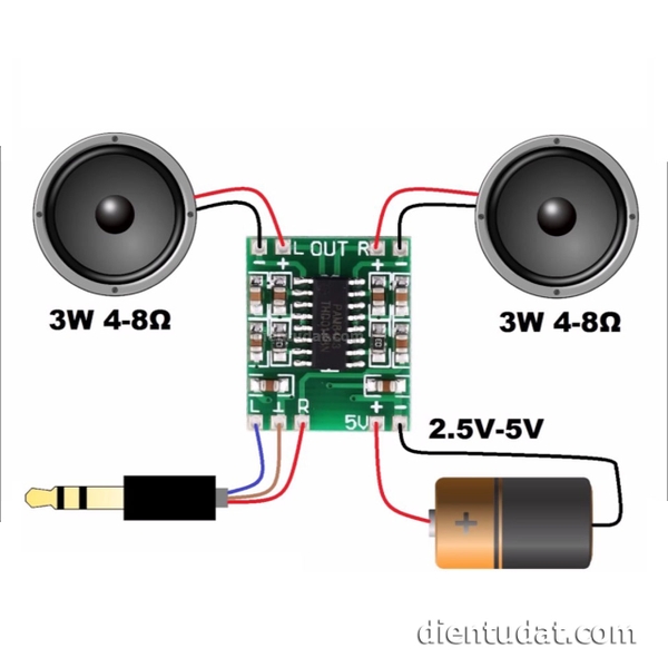 Module khuếch đại âm thanh PAM8403 với tổng công suất 6W cho 2 ngõ ra chuẩn khuếch đại class D mang lại âm thanh chất lượng cao và hiệu suất vượt trội. Sản phẩm sử dụng nguồn 5VDC , thích hợp với ứng dụng khuếch đại âm thanh cần sự nhỏ gọn và sử dụng biến áp thấp.