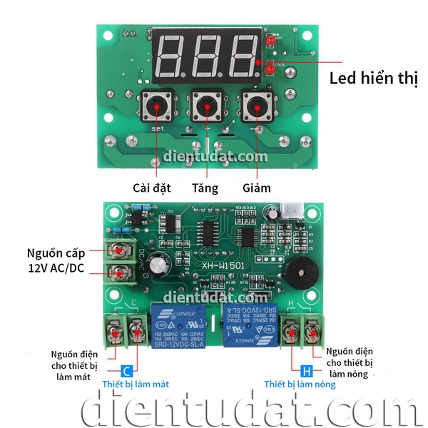 Mạch Kiểm Soát Nhiệt Độ Đóng Ngắt 2 Kênh Nóng Lạnh hoạt động với chức năng tương tự với chế độ Auto của mạch W1504 có thể đóng ngắt 2 Relay làm nóng và làm mát riêng biệt.