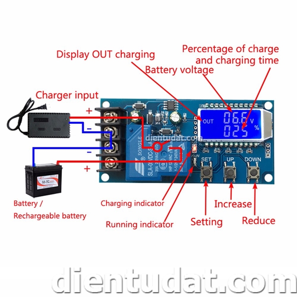 - Khi điện áp Pin thấp hơn giá trị Dn mạch sẽ đóng relay, lúc này bộ đếm bắt đầu đếm, khi điện áp Pin lớn hơn giá trị UP mạch sẽ ngắt relay, sau khi bộ đếm hoàn thành mạch sẽ tắt ngõ sạc ra.