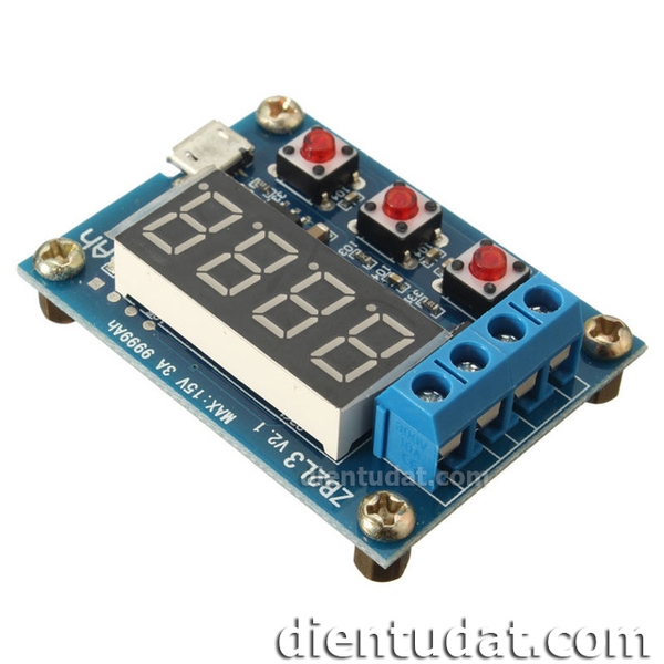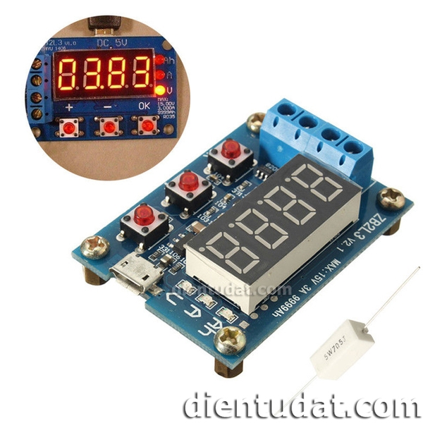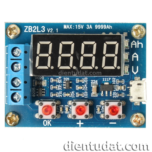 - Sau khi nhấn nút "OK" mạch sẽ bắt đầu hoạt động, đèn chỉ thị sẽ đổi liên tục các vị trí báo dung lượng, dòng điện và điện áp. Khi đạt đến điện áp dừng đã cài đặt, mạch sẽ tự động ngắt tải và lưu lại giá trị dung lượng và đồng thời đèn chỉ thị được nhấp nháy liên tục báo hiệu đã hoàn tất.