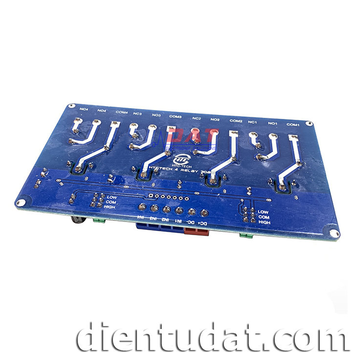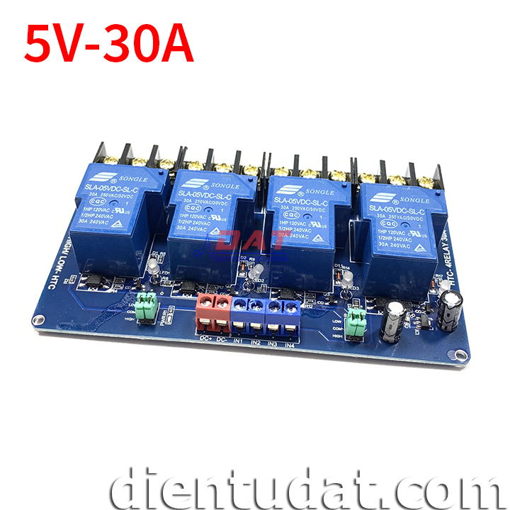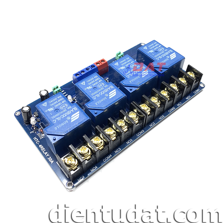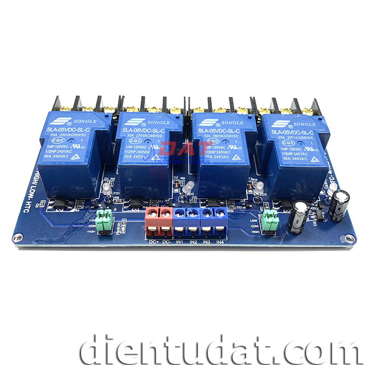Module 4 Relay 30A - 5V Kích High/Low HTC được thiết kế với opto cách lý và transistor giúp cho việc sử dụng trở nên an toàn với board mạch chính, mạch được sử dụng để đóng ngắt nguồn điện công suất cao AC hoặc DC, có thể chọn đóng khi kích mức cao hoặc mức thấp bằng Jumper.