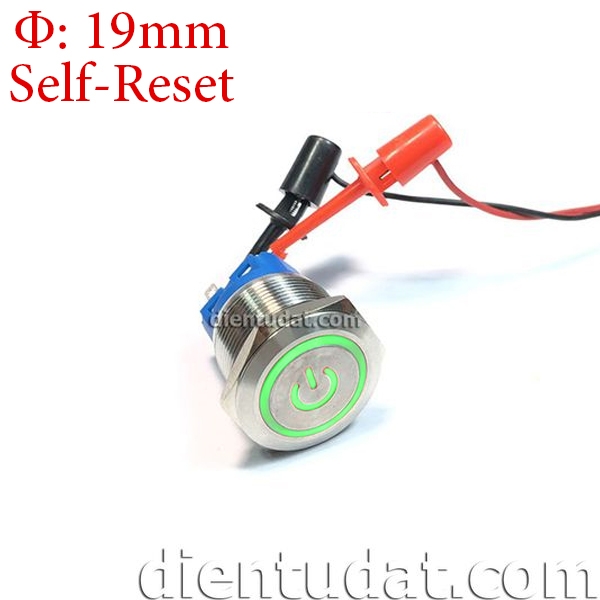 Nút Nhấn Nguồn Không Tự Giữ 19mm 5 Chân - Vòng Đèn Xanh lá 12V là một nút nhấn công tắc với 3 chân thường đóng (NC), thường hở (NO), chân chung (C) và 2 chân + - để cấp nguồn cho đường viền Led sáng.